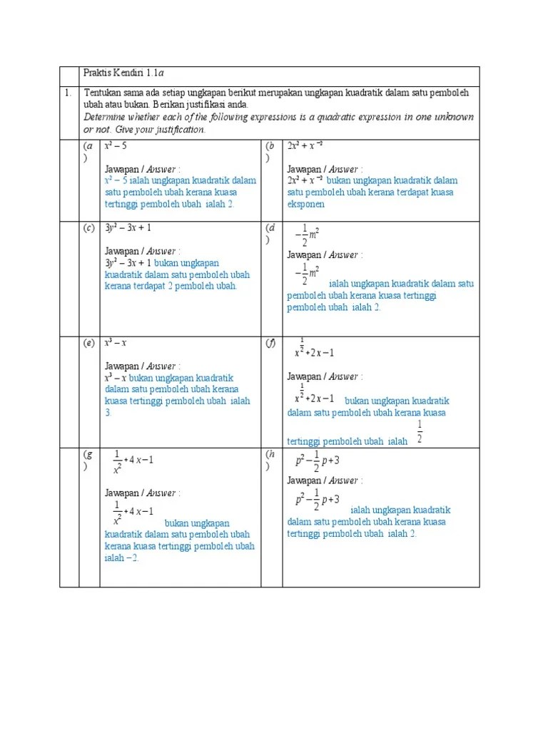 Tentukan sama ada setiap ungkapan berikut merupakan ungkapan kuadratik dalam satu pemboleh ubah atau bukan. Bab 1 matematik tingkatan 4.